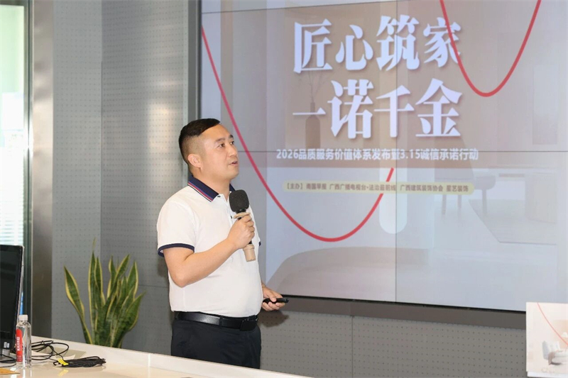 紧接着,星艺南宁区域副总经理胡四民上台对“匠心筑家,一诺千金”主题进行发布,胡总从品牌、诚信、品质、服务四大维度解读星艺装饰2026品质服务价值体系:“工程款专款专用,银行监管,只做装修。”、“签订正式施工合同后,按照合同执行。一口价,拒绝增项。”、“工程不转包、不分包,七级质检制度守护,质量不达标砸掉免费做。”等内容,并现场承诺星艺装饰为业主提供标准化、有保障的“放心家”服务。