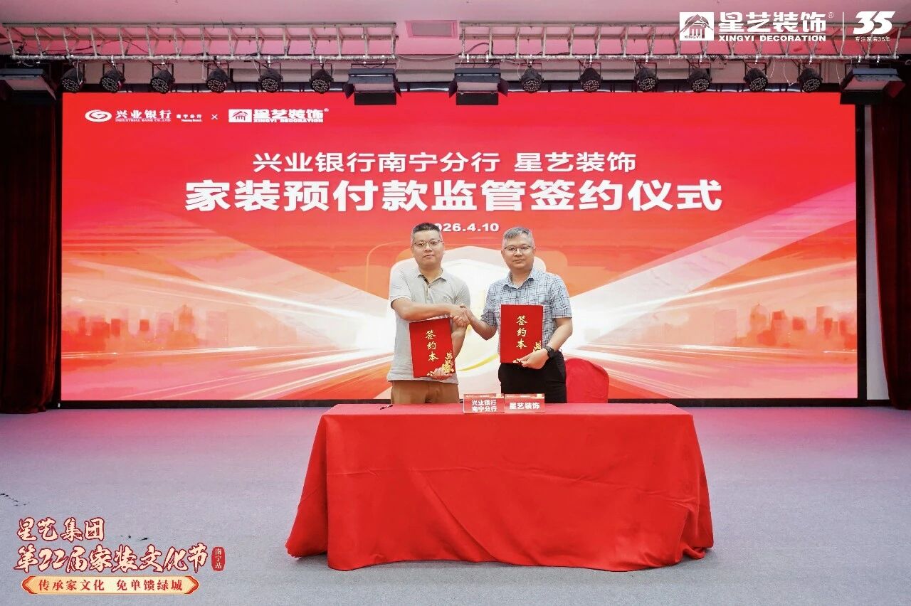 启动会现场,集团总裁孙师恒与兴业银行南宁分行副行长孙晓鹏签订装修预付款银行监管协议。旨在严守装修专款专用原则,全程保障客户资金安全,让广大选择星艺装饰的业主放心装。
