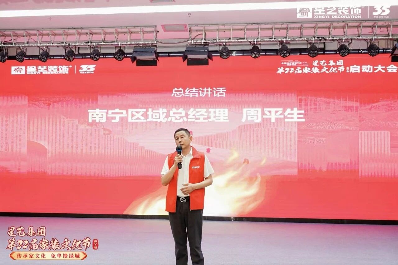 集团总裁孙师恒在启动会上表示,星艺装饰深耕家装35载,以匠心筑家,融文化于家装,传承家文化。星艺广西团队持续深耕,将家装文化节打造成品牌核心盛事。本届以“专业+拼搏”为主题,秉持“冠军之选、安心之托”承诺,推出婵宝新家·冠军同源工艺,以冠军标准升级工程与服务,坚守品质与初心,创新赋能,凝聚合力,共筑安心之家。