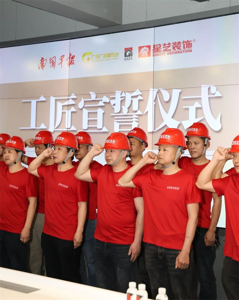 现场,星艺设计师、项目监理、工人以及星艺合作商家代表上台宣誓,从设计到管理,从施工到用材,把控好每一道工序,做到设计贴心,坚守底线,决不以次充好,用责任心守护工程品质,用良心树立行业标杆,为品质交付认真履行。