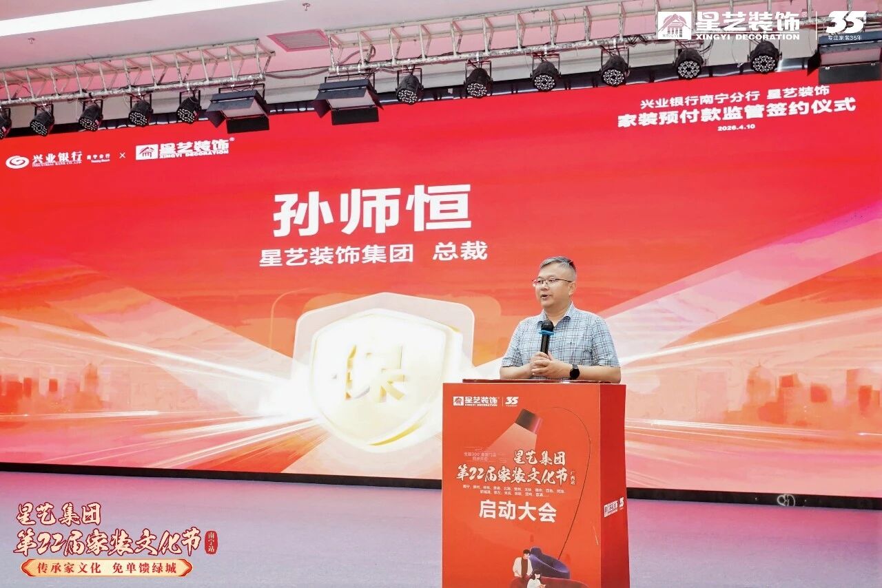 集团总裁孙师恒在启动会上表示,星艺装饰深耕家装35载,以匠心筑家,融文化于家装,传承家文化。星艺广西团队持续深耕,将家装文化节打造成品牌核心盛事。本届以“专业+拼搏”为主题,秉持“冠军之选、安心之托”承诺,推出婵宝新家·冠军同源工艺,以冠军标准升级工程与服务,坚守品质与初心,创新赋能,凝聚合力,共筑安心之家。